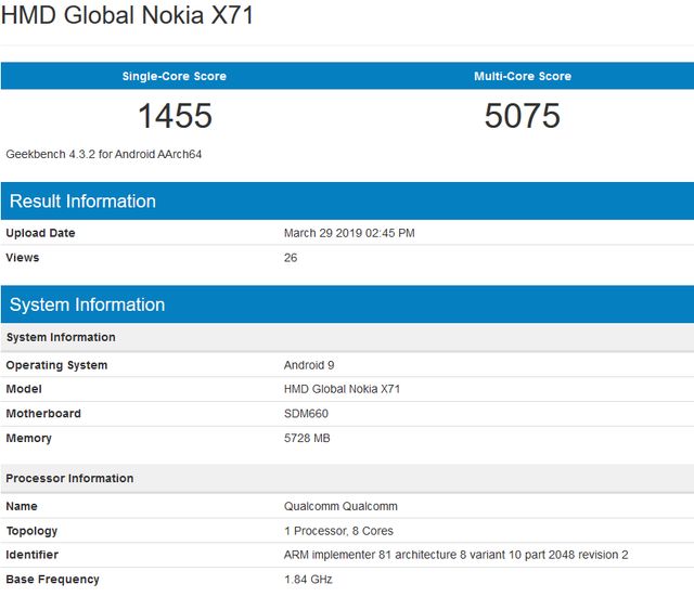 Бренд Nokia уже оголосив дату презентації нового смартфона під назвою Nokia 6.2 (X71), однак технічні характеристики пристрою досі залишалися невідомі. Тепер же сайт Geekbench опублікував результати тестування майбутнього апарата.