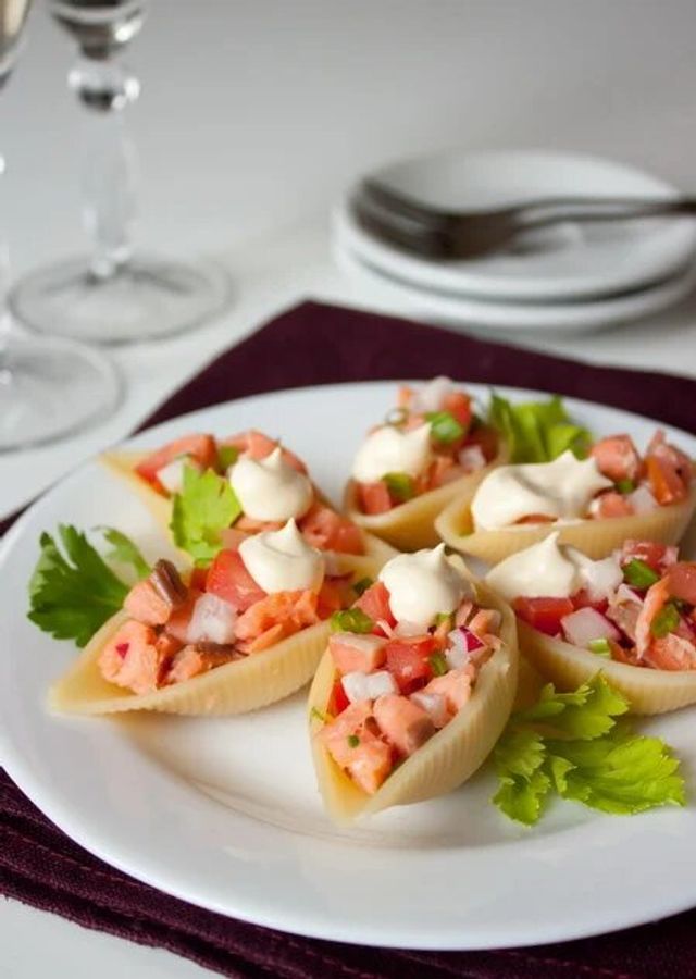 - Кожну мушлю начиняйте салатом і викладайте їх, фаршированих салатом, на помідори.