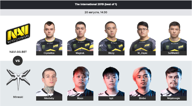 Українська команда Natus Vincere позмагається з представником Південно-Східної Азії. Матч для NAVI буде неймовірно важким, адже на кону продовження виступу на турнірі, а формат best of 1 не дає права на помилку. Відзначимо, що призовий фонд The International 2019 становить понад 33 мільйони доларів, а переможець отримає 15 мільйонів. Бажаємо успіху "чорно-жовтим"!