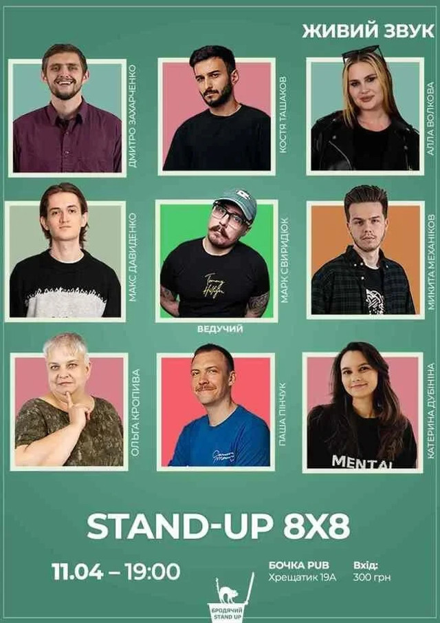 Цього вечора для вас виступатимуть 8 талановитих коміків, і кожен із них має лише 8 хвилин, щоб розсмішити вас до сліз своїми новими жартами! Це буде вечір свіжих ідей, несподіваних поворотів і вибухових моментів. Не пропустіть шанс стати частиною цього унікального стендап-шоу – вечора коротких, але яскравих виступів, де кожен комік покаже свій максимум.