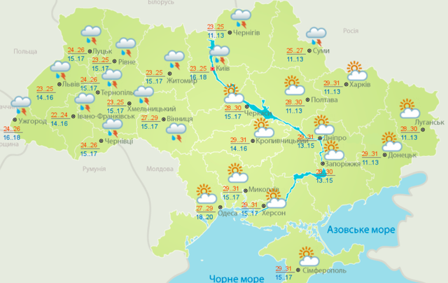 Температура повітря у північних і західних областях сягне +22+27, а на решті території до +27+32. У Києві 24 серпня дощитиме, а повітря прогріється до +23+25.