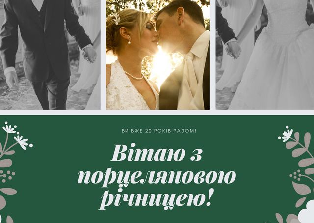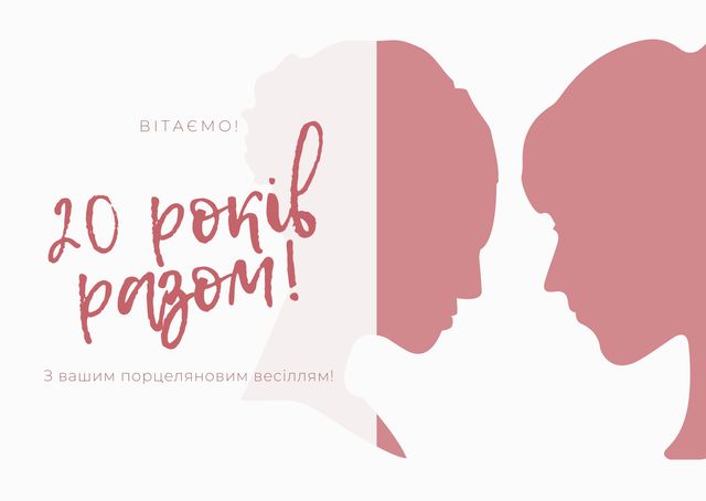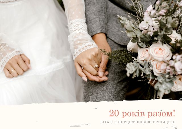 Вітаю з чудовим ювілеєм вашого сімейного життя, з 20-річчям вашого шлюбу. У порцелянове весілля бажаю вам наповнювати затишні сімейні вечори радісними спогадами та чудовими моментами, зберігати щасливу і теплу атмосферу в домі, завжди підтримувати один одного і берегти свою любов.