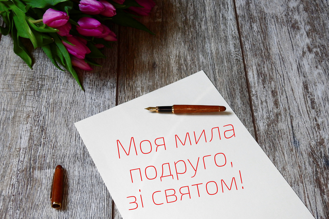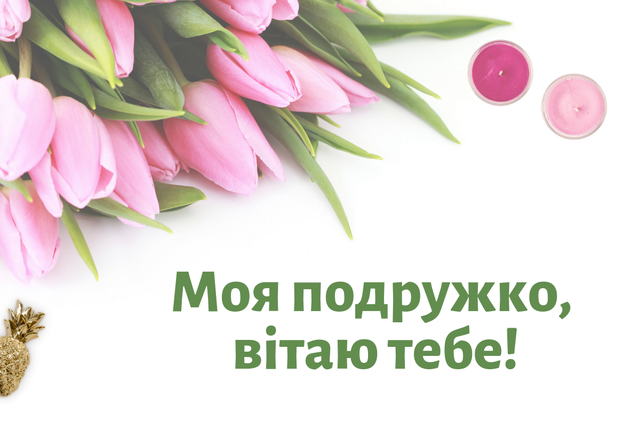 Дорога моя, подруго! Я хочу побажати тобі найголовнішого – простого, але справжнього жіночого щастя! У кожної з нас, звичайно, різне розуміння цього поняття. Хтось не проти додати туди достатку, кар'єрного зростання, перемог над собою й іншими... Але справжнє жіноче щастя – це можливість кохати й бути коханою! Бажаю тобі, рідна, щоб любов наповнювала твоє життя і була джерелом натхнення для всього, що ти робиш!