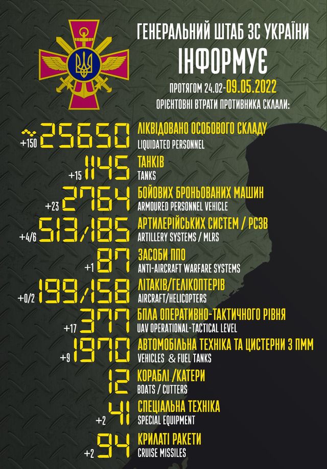 Відзначимо, що станом на 9 травня ліквідовано 1 145 російських танків та 2 764 бойові броньовані машини. Загальні втрати військ РФ з початку повномасштабного вторгнення в Україну мають такий вигляд: