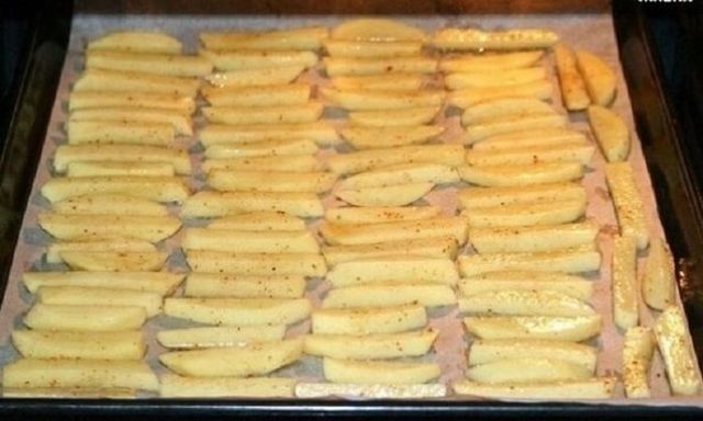 - Застеліть на деко пекарський папір і викладіть на нього картоплю акуратними рядами.
