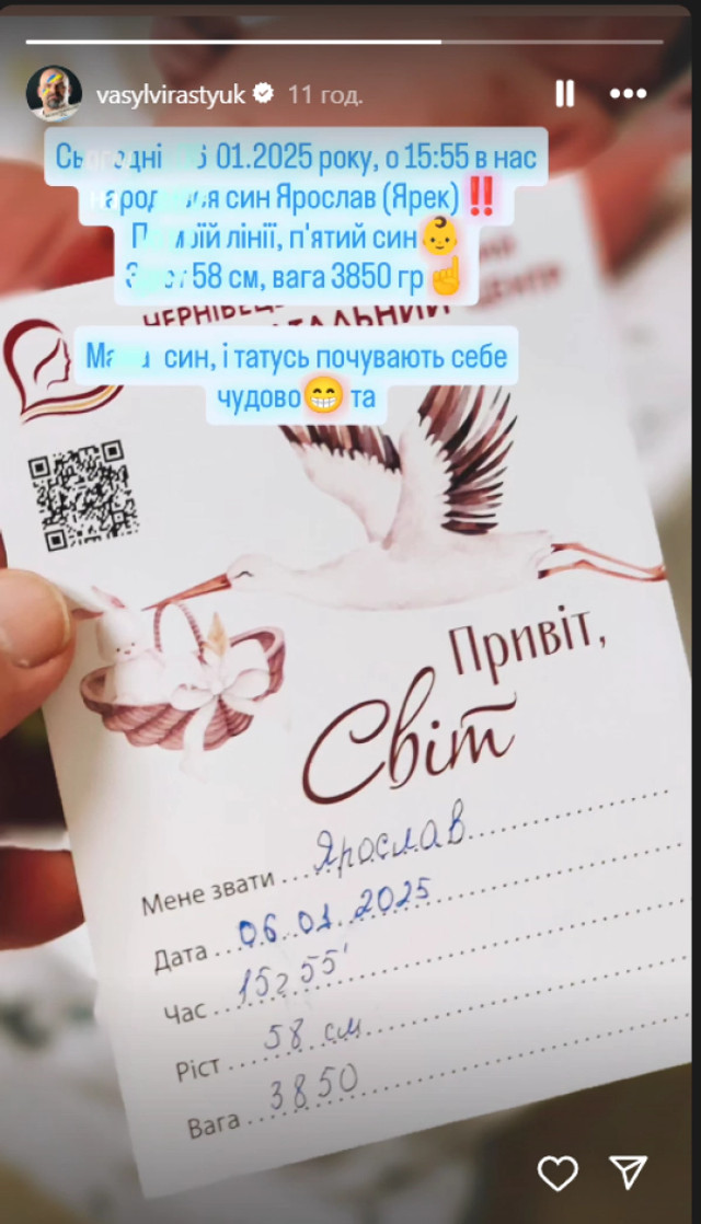 По моїй лінії – п'ятий син. Зріст 58 см, вага 3850 г. Мама, син і татусь почувають себе чудово, – повідомив він.