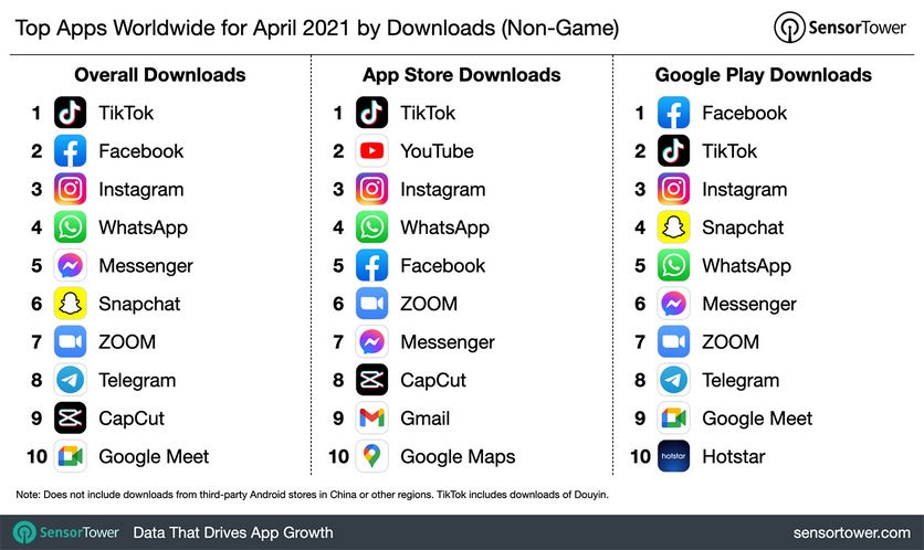 Дослідницька фірма Sensor Tower представила звіт про найпопулярніші мобільні додатки за підсумками квітня 2021 року. Статистика показує, що в основному користувачі завантажують загальновідомі додатки, а різниця між користувачами iOS і Android зовсім мінімальна.