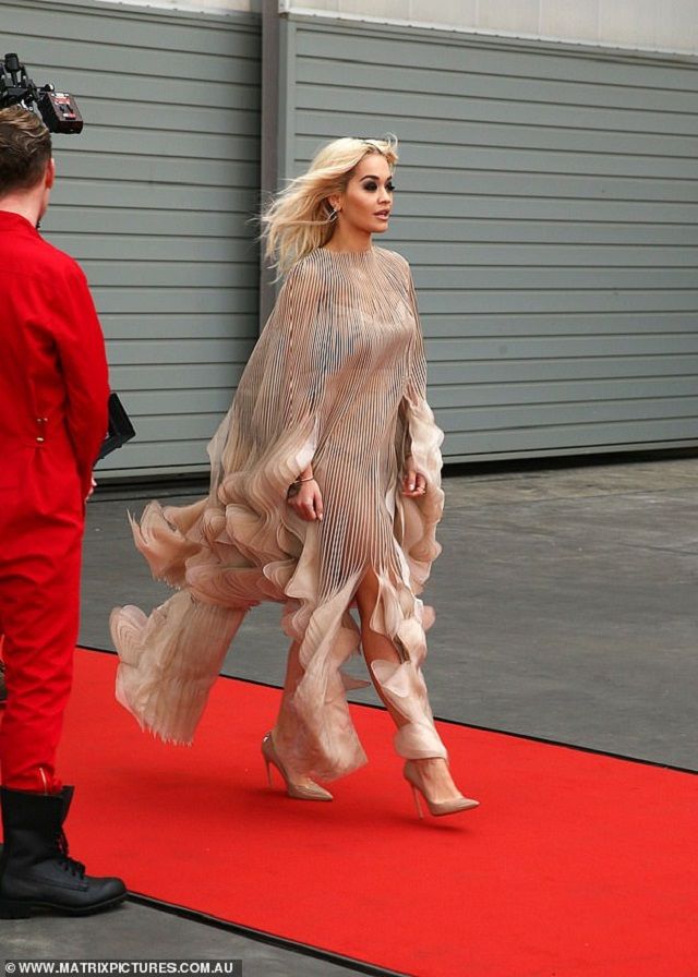 Ора вдало позувала перед камерами, але сама хода по червоній доріжці принесла трохи еротики. Вітер підняв поділ сукні. Оголивши частину сідниць зірки.