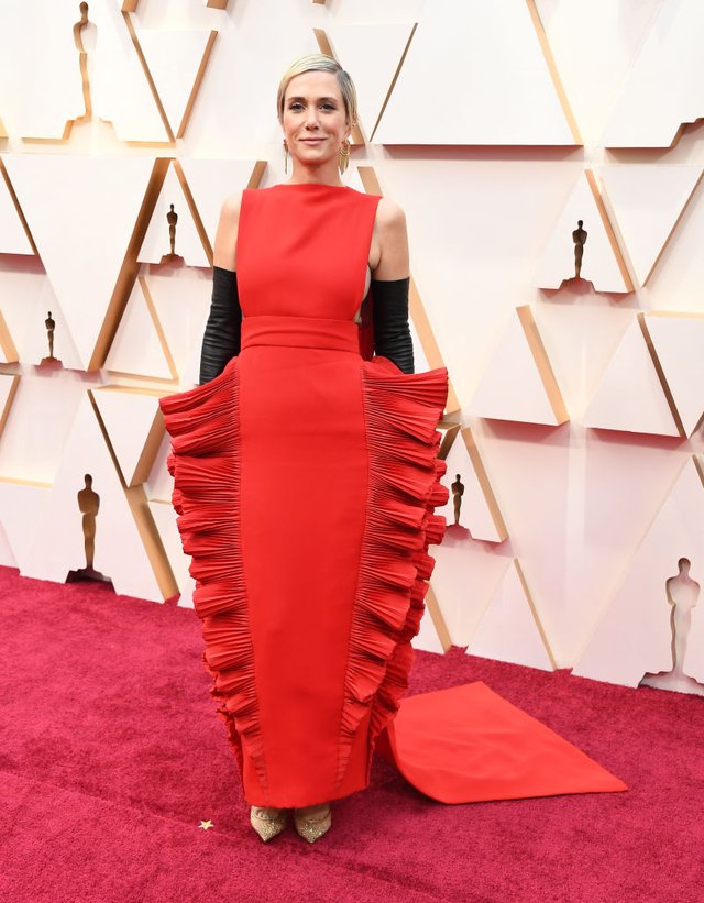 Американська акторка Крістен Віг вибрала червону сукню від Valentino, але вражаючим образ виявився хіба у негативному значенні. Рюші перетворили зірку на величезну отруйну гусінь чи багатоніжку, що скоріше викликає відразу, а не захоплення.