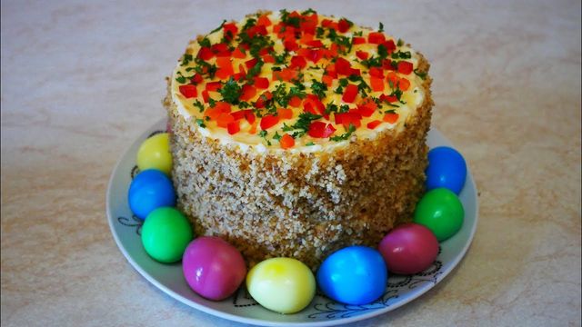 - Накриваємо салат тарілкою, акуратно перевертаємо і знімаємо плівку. Бока салату обсипаємо панірувальними сухарями. Зверху прикрашаємо салат нарізаним солодким перцем.