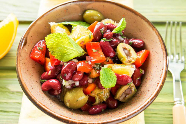 - Цибулю і перець наріжте кубиками, а маслини – навпіл. Змішайте в мисці апельсини, цибулю, перець і маслини, додайте квасолю.