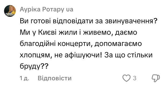 Ви готові відповідати за звинувачення? Ми у Києві жили та живемо, даємо благодійні концерти, допомагаємо хлопцям, не афішуючи. За що стільки бруду? Схаменіться, люди!