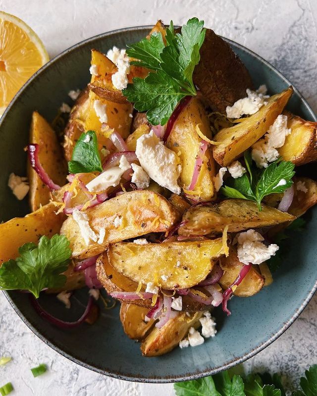 - Подавайте картоплю з подрібненою фетою, цедрою лимона та петрушкою.