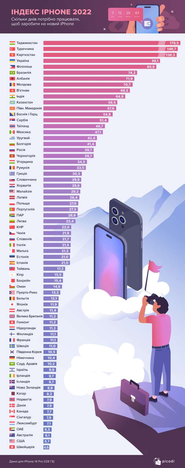 Довше за українців заробляти на iPhone 2022 року будуть громадянам лише у трьох країнах світу – Киргизстані, Туреччині і Таджикистані. Найбільше часу для цього треба таджикистанцям – 179 днів. А найменше працювати доведеться у Швейцарії – лише 4,6 робочих дні.