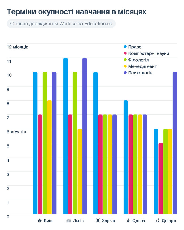 Згідно з дослідженням, найшвидше окупається вища освіта за спеціальністю "Компʼютерні науки" в Дніпрі, а найдовше – "Право" й "Психологія" у Львові. Вартість навчання на бакалавраті за спеціальністю "Право" в Києві становить 177 368 гривень. Середня зарплата юриста в Києві становить 19 000 гривень на місяць. Отже, час, за який можна відшкодувати витрати на навчання, – 10 місяців.