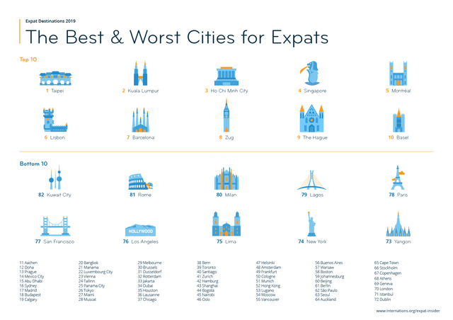 Також в ТОП 10 найкращих міст для переїзду в якості емігранта увійшла столиця Малайзії Куала-Лумпур, в'єтнамський Хошимін, Сінгапур, канадський Монреаль, Лісабон в Португалії, іспанська Барселона, Цуг у Швейцарії, Гаага в Нідерландах і швейцарський Базель відповідно.