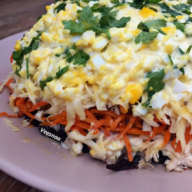 - У глибокій мисці змішайте сир, майонез і пропущений через прес часник. Горіхи злегка обсмажте і подрібніть. Моркву відваріть і потріть на крупній тертці. Почніть викладати салат шарами. 1 шар чорнослив, змащений майонезом, курка, сіль, перець і знову майонез; 2 шар горіхи, змішані з морквою, зверху сирний шар і яєчний білок; все змастіть майонезом, з усіх боків, а верх прикрасьте курячим жовтком.