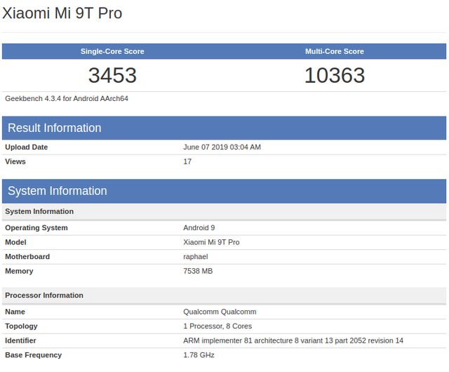 Смартфон Xiaomi Mi 9T Pro протестували у бенчмарку Geekbench