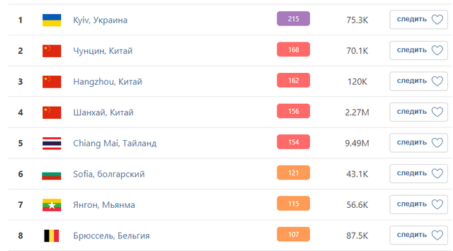 Станом на ранок 17 квітня у Києві, за даними порталу Iqair, який відстежує рівень якості повітря у найбільших містах світу, зафіксовано 215 одиниць. Нагадаємо, що нормою є до 50 одиниць.
