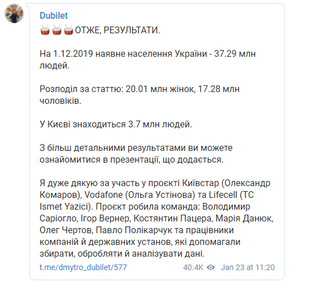 Відзначимо, що згідно з інформацією Дубілета, в Україні живуть 37,289 мільйона людей. Це дані станом на 1 грудня 2019 року без урахування непідконтрольних територій Донбасу і анексованого Криму.