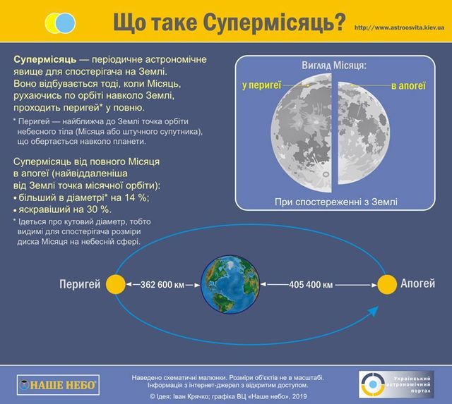Супермісяцем називають повний Місяць, який проходить перигей (найближчу до Землі точку своєї еліптичної орбіти) на відстані менше ніж 362 000 км. Саме таке астрономічне явище ми побачимо 19 лютого: Місяць виглядатиме на 14% більше і на 30% яскравіше, ніж при проходженні найбільш віддаленої точки – апогею.