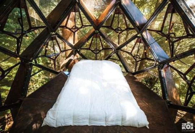 Споруда знаходиться на висоті 18 метрів над землею. Тут є двоспальне ліжко, біотуалет і ванна з раковиною і душем. Одна ніч коштує тут $246. Зараз цю незвичну споруду виставляють на продаж, але ціну поки не оголосили. Будинок закріпили на деревах у 8 точках. Він практично нерухомий. При цьому для виробництва знадобилося 5,5 т. заліза. Прозорі стіни забезпечують чудесний краєвид навколо будинку.