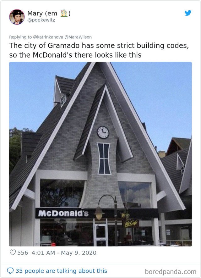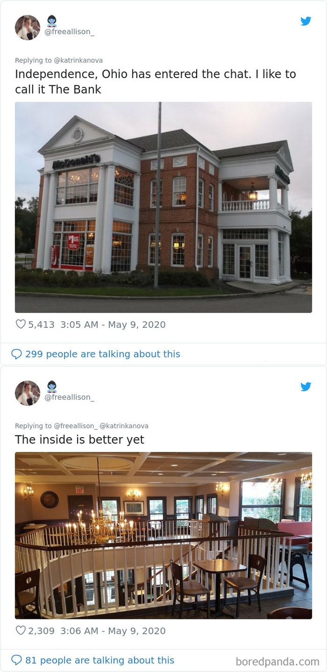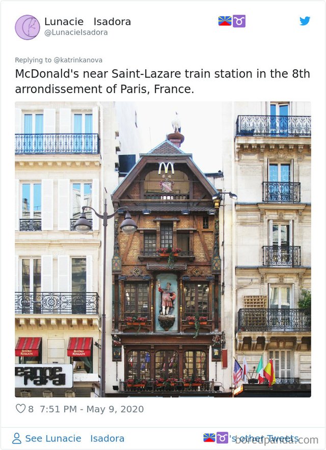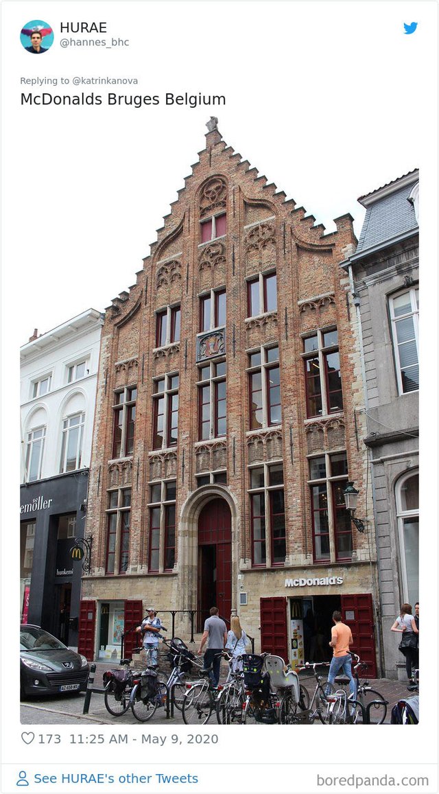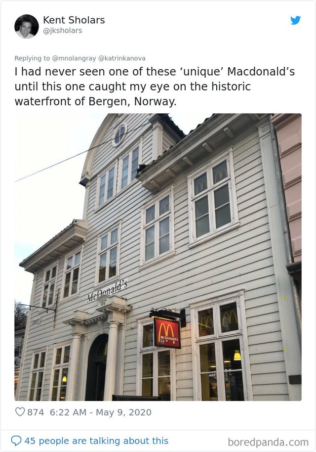 Найбільша мережа закладів харчування McDonald’s не тільки може змінювати меню у різних країнах, а й обирати доволі незвичайні споруди для свого розташування. Користувачі мережі зібрали найдивніші та найепічніші будівлі McDonald’s, яка викликають бажання обов'язково там побувати. Зацініть: