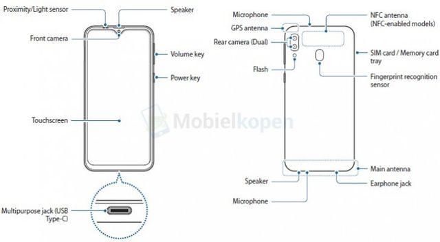 Samsung Galaxy M стануть першими смартфонами виробника, оснащені екранами Infinity-V Display з краплеподібними вирізами. Власне, інструкція є наочним тому підтвердженням. А ще вона дає уявлення про розташування фізичних кнопок керування та різних ключових компонентах пристрої на кшталт модуля NFC, роз'єму 3,5 мм і порту USB-С (так, він теж буде).