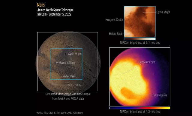 Перші знімки Джеймса Вебба показують східну півкулю планети у двох різних діапазонах. На зображенні, зробленому у короткому хвильовому діапазоні, переважає відбите сонячне світло. На ньому можна розрізнити деталі поверхні планети. До них, наприклад, відноситься кратер Гюйгенс, 450-кілометровий ударний кратер і темні вулканічні породи в районі плато Великий Сирт.