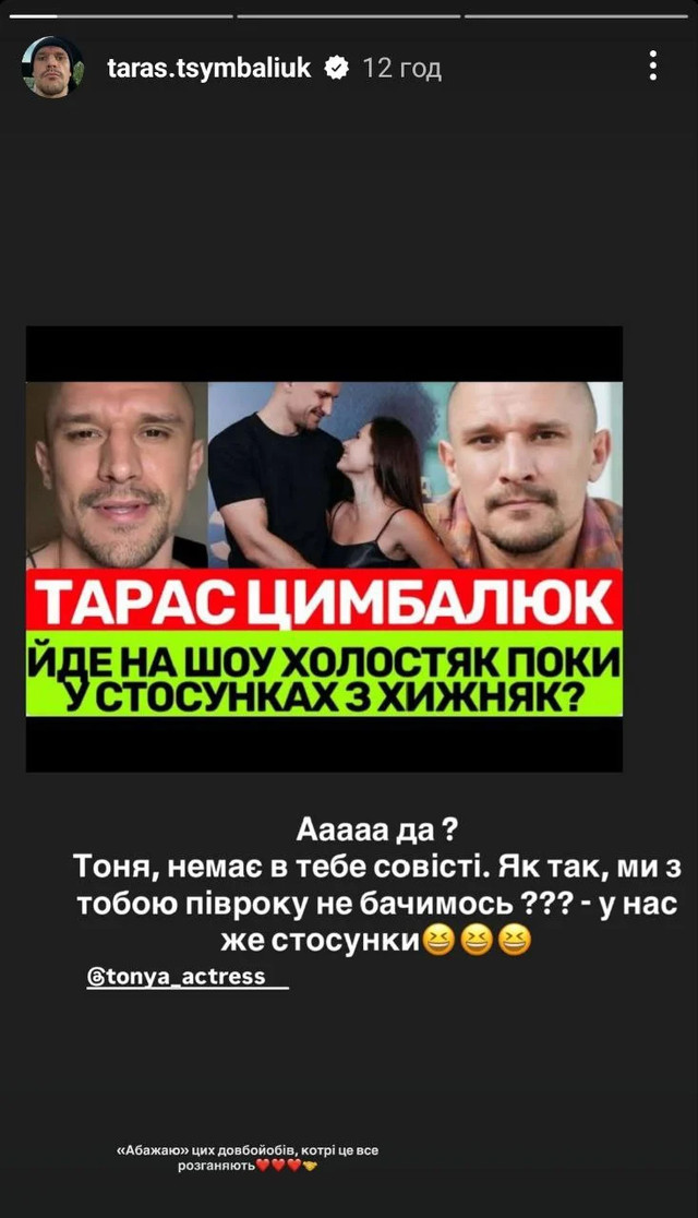 Тоня, немає в тебе совісті. Як так, ми з тобою пів року не бачимось? У нас же стосунки, – написав Цимбалюк.