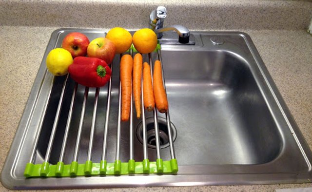Щоб вода не стікала по поличках і столу, була винайдена спеціальна сушарка. Вона кріпиться на мийку і економить місце на кухні. Крім посуду там можна сушити вимиті овочі та фрукти.