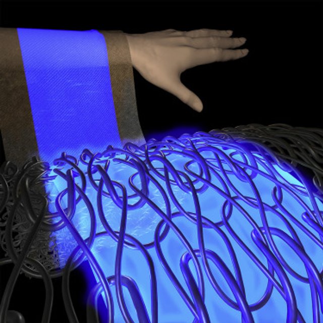Крім того, вони покрили матеріал золотом. Метал використовується тут як електрод. Тканина складається з двох шарів, між якими прокладений ще один, еластичний і напівпрозорий, здатний випромінювати світло. Щоправда, відбувається це тільки при підключенні нового матеріалу до джерела змінного струму з напругою в кілька сотень вольтів.