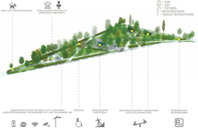 Також планують озеленити вулиці і парк ім. Котляревського, встановити систему сортування сміття, "розумні" лавки і зупинки з сонячними батареями і можливістю підзарядки гаджетів, мережі електрозаправок і сенсори екологічного стану вулиць