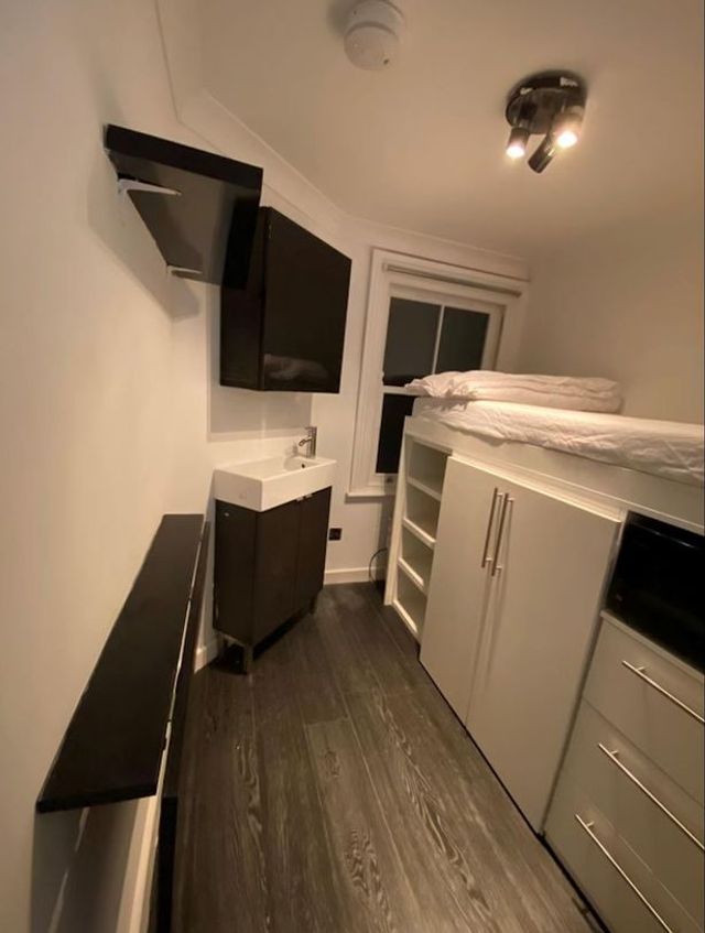 На цій крихітній площі розмістили односпальне ліжко, шафу, полиці, мікрохвильову піч, місце для маленького холодильника і раковину. Ба більше, у квартирі є окрема кімната з туалетом, душем та раковиною.