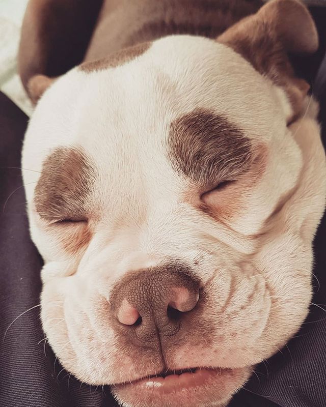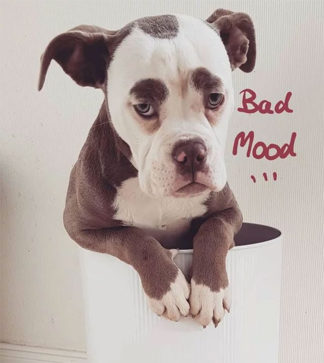 Знайомтесь, це Мадам Брови (Madame Eyebrows) – англійський бульдог, який мешкає у Німеччині, і вже став справжньою зіркою мережі через свій невеселий вигляд. Саме сірі плями над очима створюють ілюзію того, що пес має брови, а також робить його мордочку засмученою.
