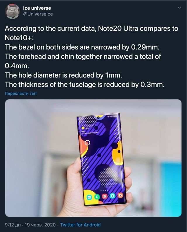 Зміни, за словами інформатора, торкнуться і корпусу Galaxy Note20 Ultra. Очікується, що він стане на 0,3 міліметра тоншим, ніж у Galaxy Note10+. При цьому товщина рамок по периметру дисплея зліва і справа буде зменшена на 0,29 мм, а зверху і знизу – сумарно на 0,4 мм. Примітне і зменшення діагоналі корпусу на 1 міліметр.