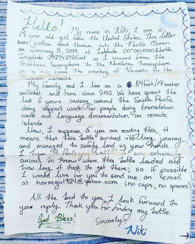 "Якщо ви це читаєте, отже пляшка подолала довгий шлях і вдало опинилася у ваших руках. Мені дуже цікаво дізнатися, куди потрапила ця пляшка і скільки часу знадобилося на те, щоб вона туди дісталася", – написала Ньє в посланні.