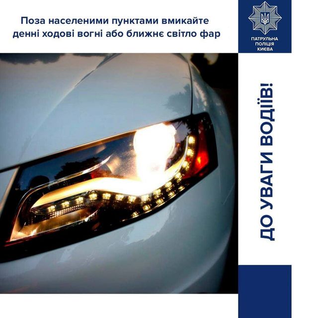 З 1 жовтня до 1 травня на усіх механічних транспортних засобах поза населеними пунктами повинні бути ввімкнені денні ходові вогні, а у разі їх відсутності – ближнє світло фар. Це передбачено п. 9.8 ПДР України. Мета такої вимоги – додатково позначати транспортний засіб в умовах недостатньої видимості в осінньо-зимовий період й запобігти в такий спосіб виникненню ДТП, – йдеться у повідомленні поліції.