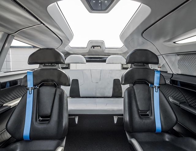 Самостійно управляти електрокаром можна за допомогою звичного керма, а приладову панель "позичили" у Porsche Taycan. Два великі монітори, розташовані праворуч і ліворуч від рульової колонки, призначені для пасажирів другого ряду. Всього в салоні три індивідуальні анатомічні крісла в карбонових корпусах, а третій ряд – тримісний диван.