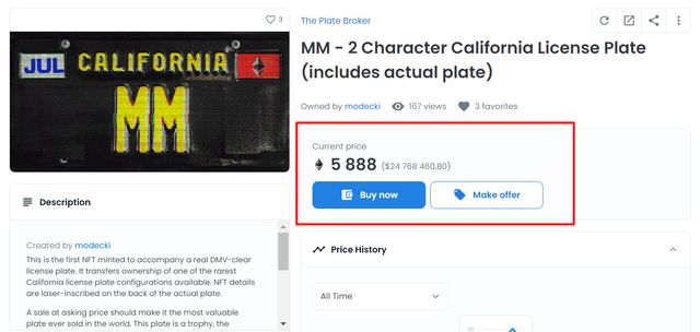 На криптовалютному онлайн-майданчику OpenSea виставили на продаж автомобільний номер штату Каліфорнія. Ціна лоту вже досягла майже 25 мільйонів доларів. На номері присутні лише два символи – літери "ММ".