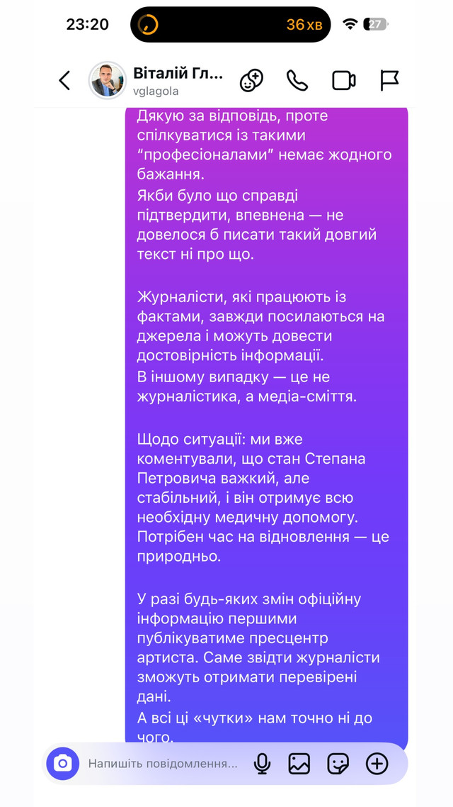 Окрім того, Ірена Зайко оприлюднила у своєму інстаграмі фрагменти листування з Віталієм Глаголою, інформує Радіо МАКСИМУМ. До речі, інформацію щодо стану здоров'я Степана Гіги журналісту надали його джерела.