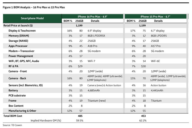 Вища собівартість виробництва iPhone 16 Pro Max може бути пов'язана з новим дисплеєм і камерою, які коштують $80 (приблизно 6 640 рупій) і забирають найбільшу частину коштів, витрачених на компоненти для нового iPhone. Нова кнопка керування камерою на 16 Pro Max коштує 19 доларів (приблизно 1 570 рупій), новий блок оперативної пам'яті – 17 доларів (приблизно 1 400 рупій), а новий біонічний чипсет A18 Pro коштує 45 доларів (приблизно 3 730 рупій) для кожної моделі.