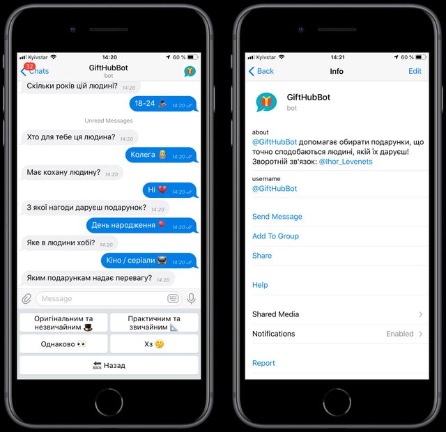 Спочатку GiftHub запустили локально, на український ринок, у вигляді Telegram-бота. Він простіший: замість автоматичного аналізу Instagram-сторінок, потрібно вибирати подарунок в діалозі. Наприклад, сказати, кому збираєшся дарувати і які у людини хобі.