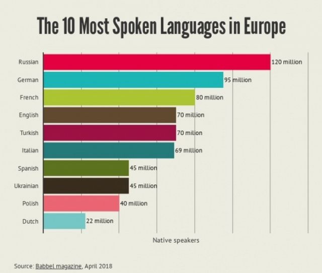 За даними джерела, Україна опинилася на 8 місці, так як українською мовою в Європі говорить 45 мільйонів людей.