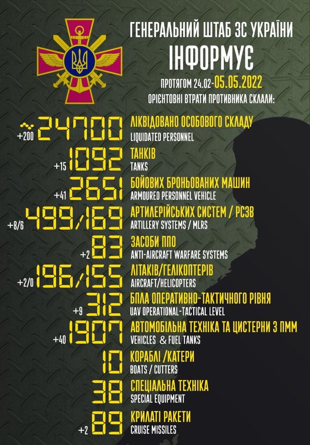 Відзначимо, що станом на 5 травня ворог втратив 1092 танки, 2651 ББМ, 1907 одиниць автомобільної техніки та автоцистерн. Загальні втрати російської армії з початку повномасштабного вторгнення в Україну мають такий вигляд: