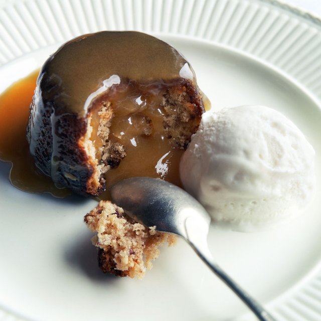 - Коли пудинг буде готовий, розігріти соус, що залишився. Перевернути пудинг на теплу тарілку і полити соусом. Подавати зі збитими вершками або морозивом.