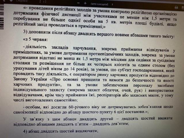 - проведення релігійних заходів просто неба за умови дотримання фізичної дистанції між учасниками не менше ніж 1,5 метра та у приміщенні за умови перебування не більше 1 особи на 5 кв. м;