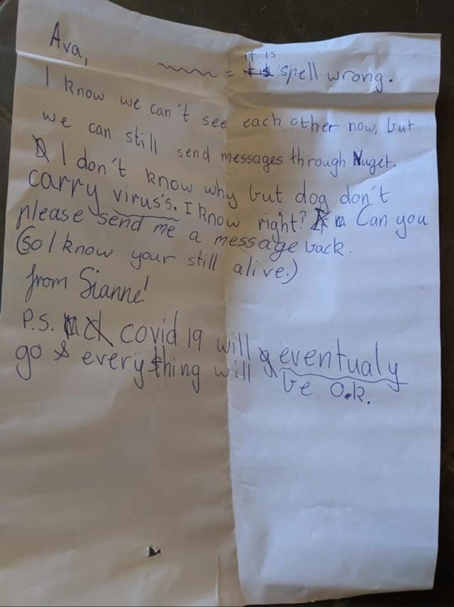 Ава, я знаю, що зараз ми не можемо бачитися одна з одною, але ми можемо відправляти повідомлення через Наггета. Я не знаю чому, але ж собаки залишають поза передачею вірусу. Можеш відправити мені теж лист (щоб я знала, що ти все ще жива)? Covid-19 в кінці кінців піде, і все буде добре, – йдеться в листі.
