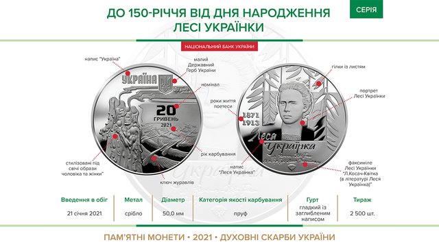 Національний банк України з 21 січня випустить в обіг пам'ятну монету номіналом у 20 грн. Вона присвячена українській поетесі Лесі Українці.