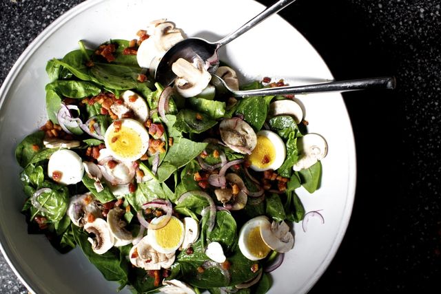 Обсмажте бекон смужками. Перекладіть бекон на тарілку і в цій же сковороді посмажте яйця, весь час помішуючи. Додати сіль, перець і порізану зелену цибулю. На широкій тарілці порвіть салатне листя, посипте зеленню, викладіть бекон і смажені яйця. Змішайте в рівних пропорціях гірчицю, лимонний сік і оливкову чи рослинну олію. Заправте салат.